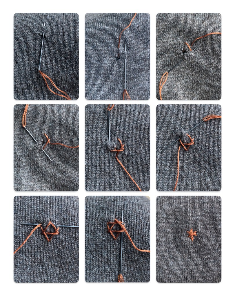 My past week was taken up a good bit by mending holes in some cashmere jumpers. Instead of just filling the holes pretending they where never there, I fill them up with little colourful stars. Maybe because I don’t have one of these cotton embroidery yarns in black. Or maybe because I would get bored very quickly. Mending a hole in the same colour, in the end doesn’t even show the result of your work. It just hides the mess up of the moths.