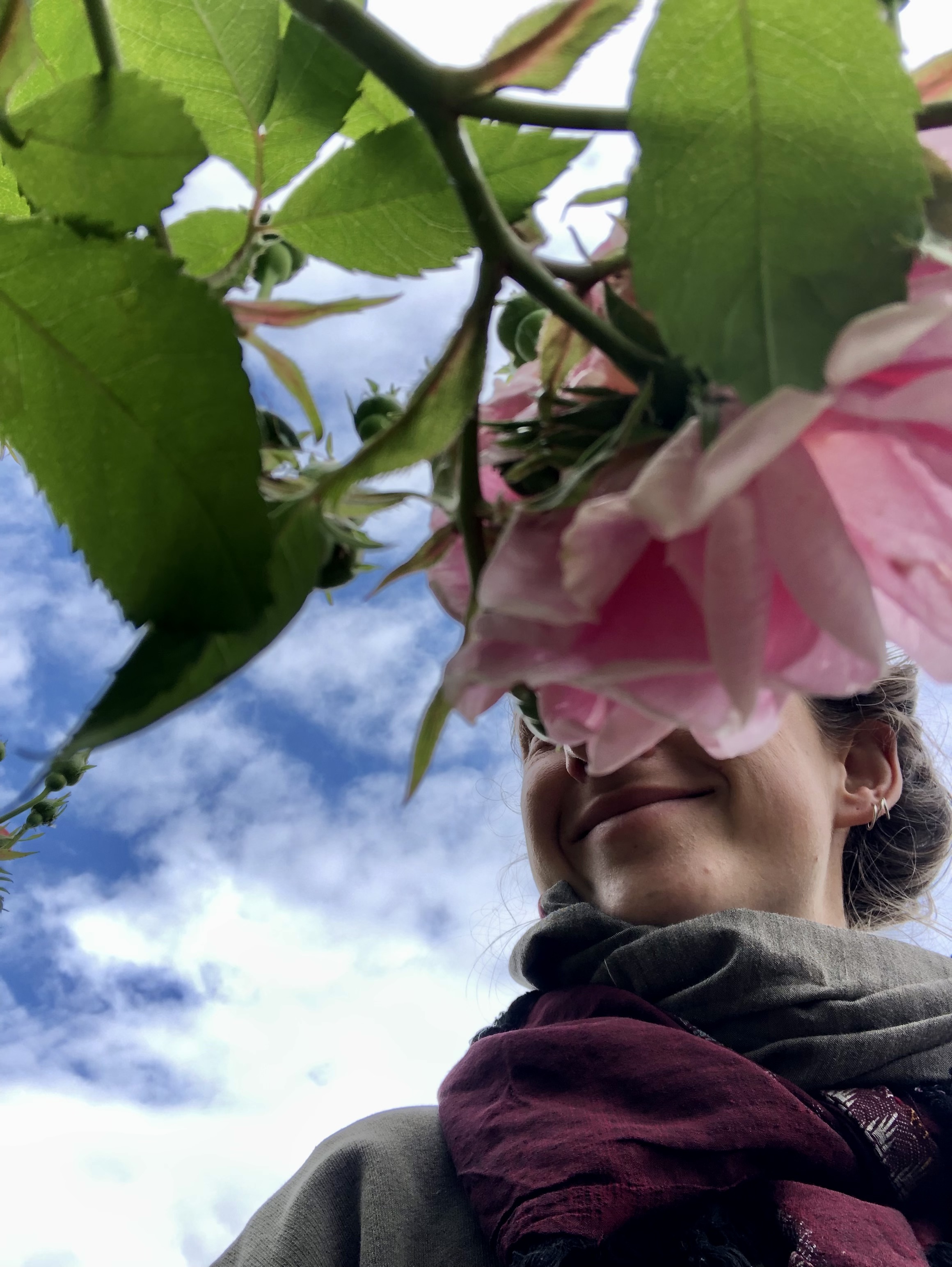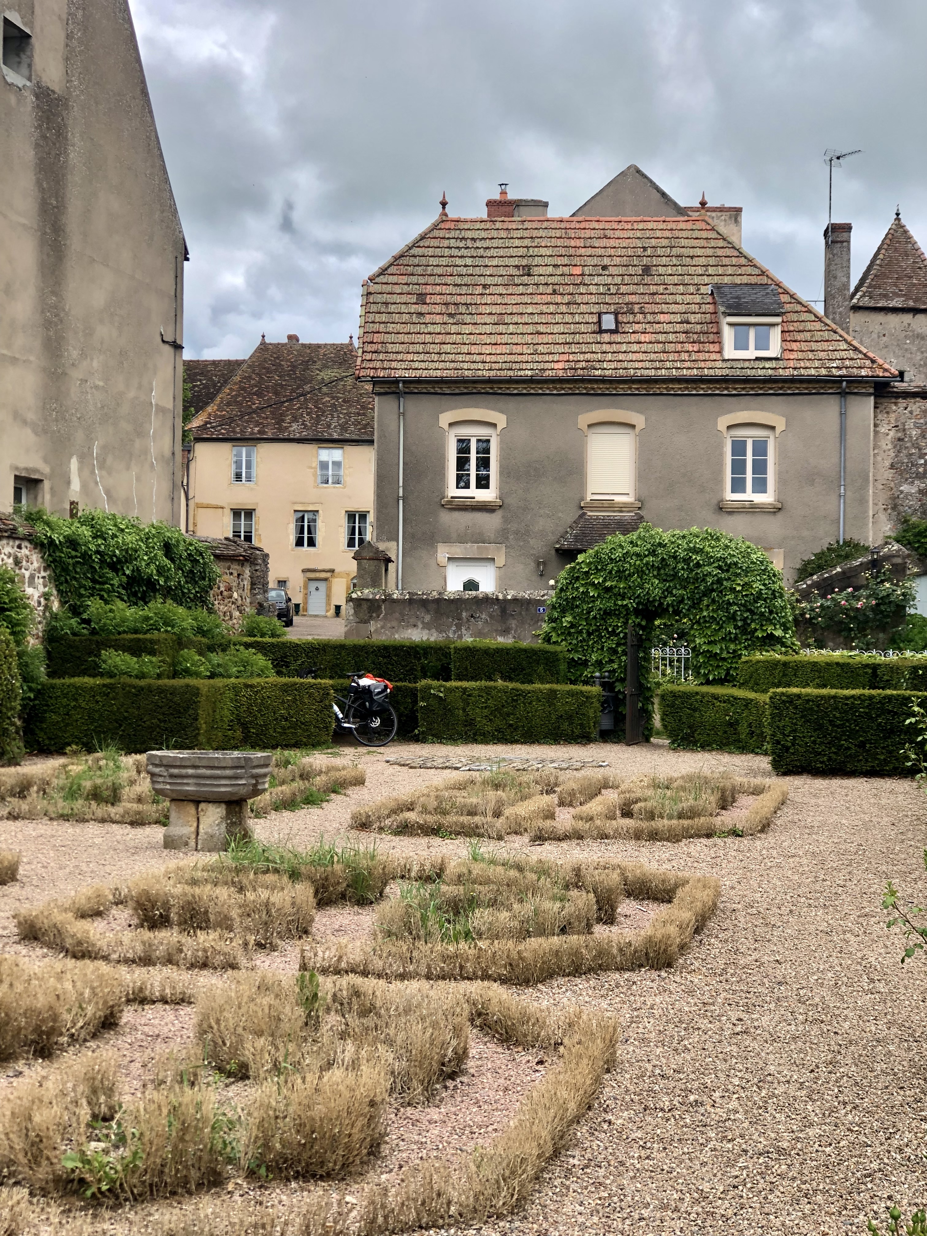 I cycle just a little bit further into the centre of the town. In mind I have, to eat this kebab, maybe on a bench in front of the church. What I find instead is a very romantic, hidden garden. An Ivy overgrown gate leads me into a different time. Roses and a view.