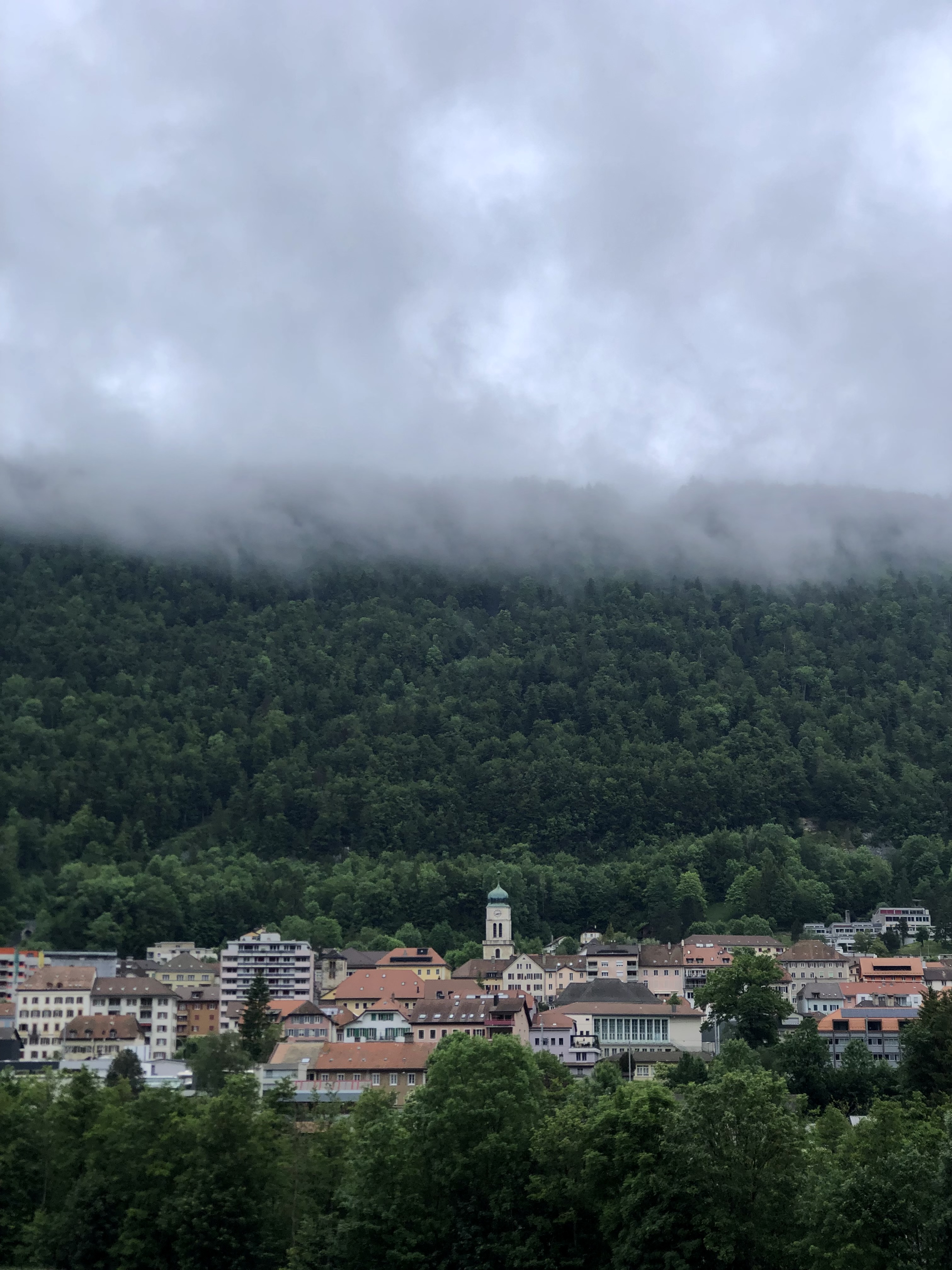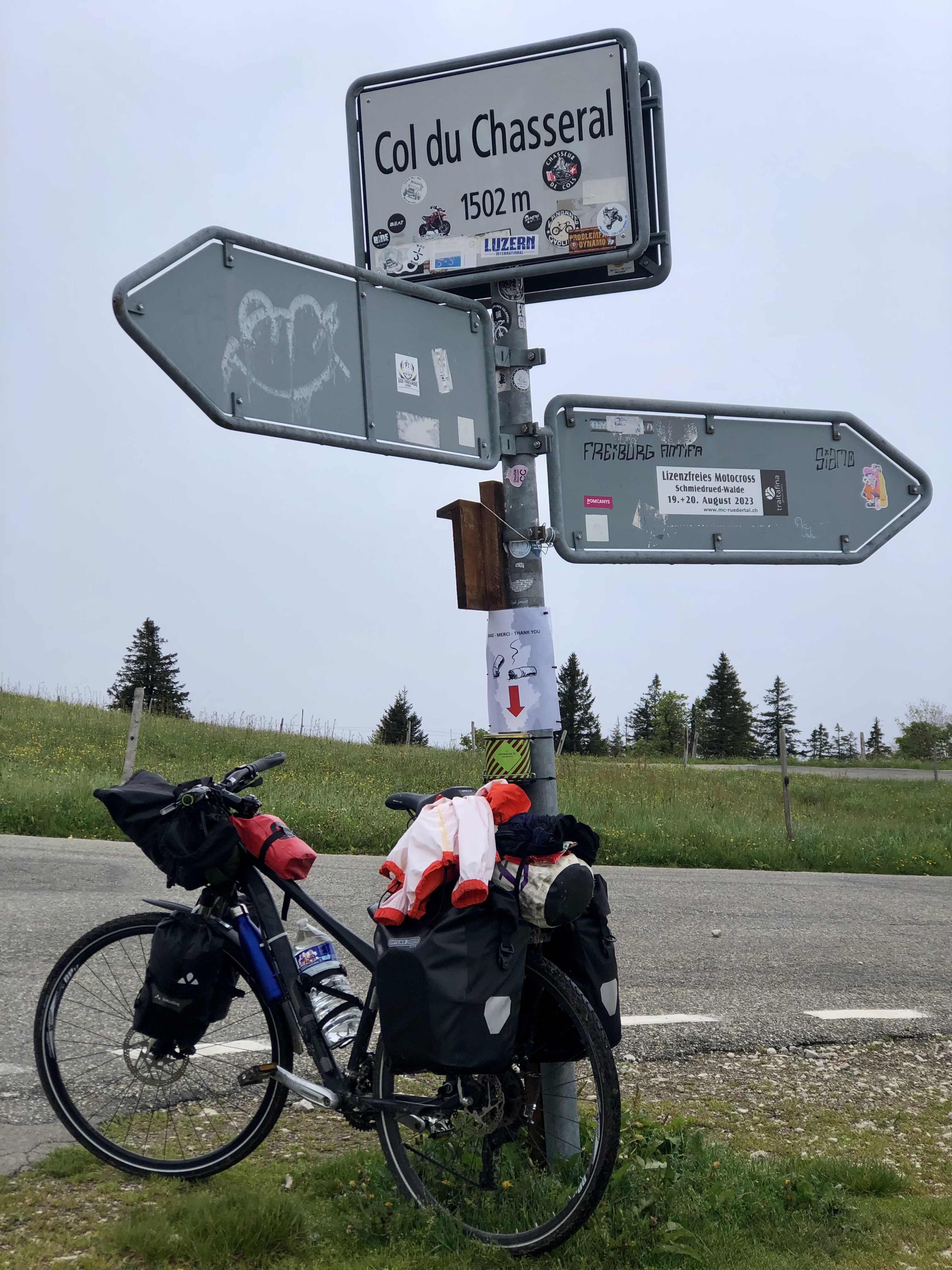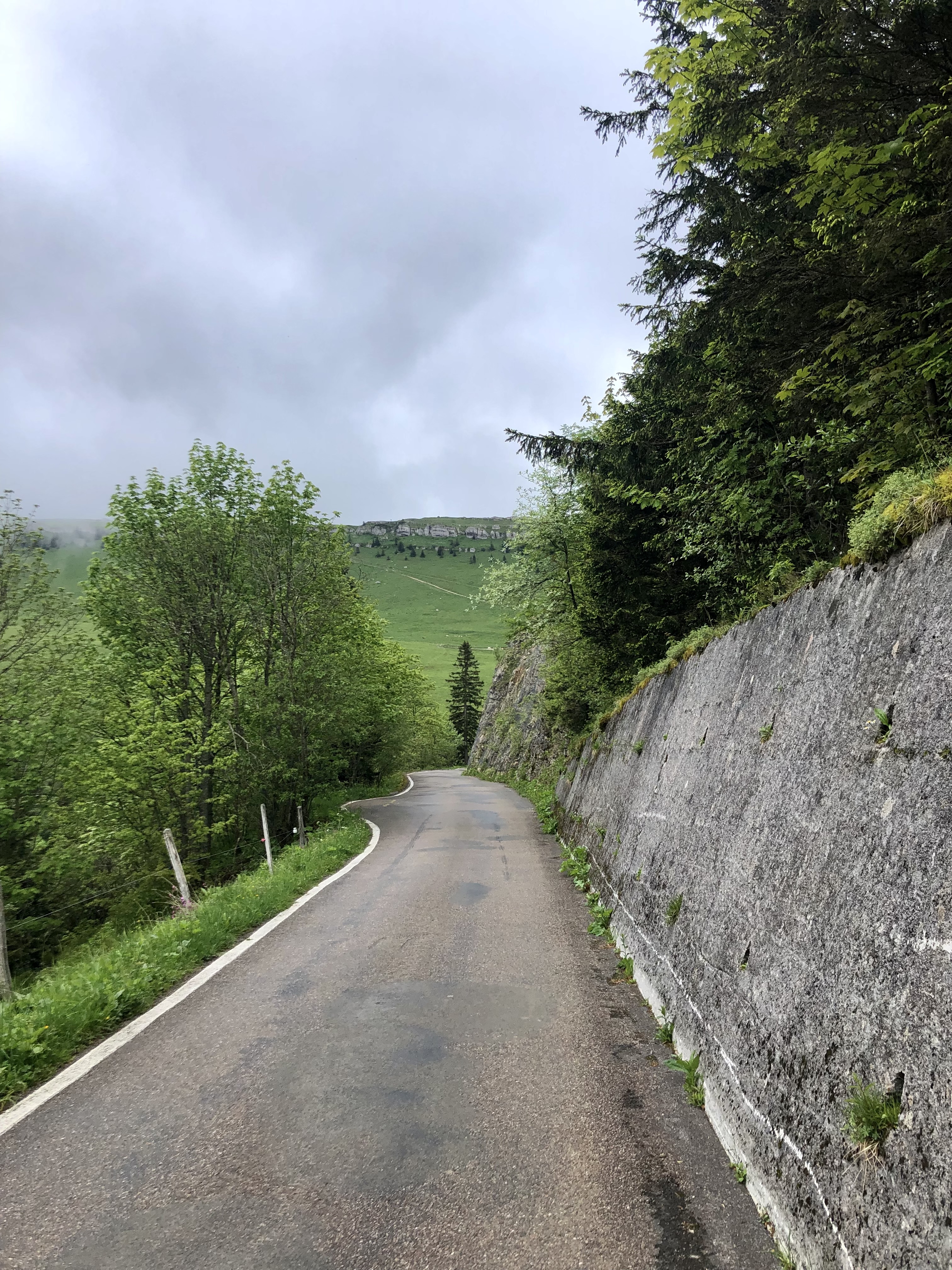 Eventually I reach a little village, my fingers didn’t freeze off and my mind got a little calmer. I buy some bananas at a market-stall that is about to set up and fill up my water bottles. Now I am as ready as I can get on a foggy morning in June, somewhere in the Swiss Jura, to clime that “Col du Chasseral” in front of me. Maybe I should thank the clouds to envelop the top of it, otherwise I might have despaired to much, to see what laid in front of me.