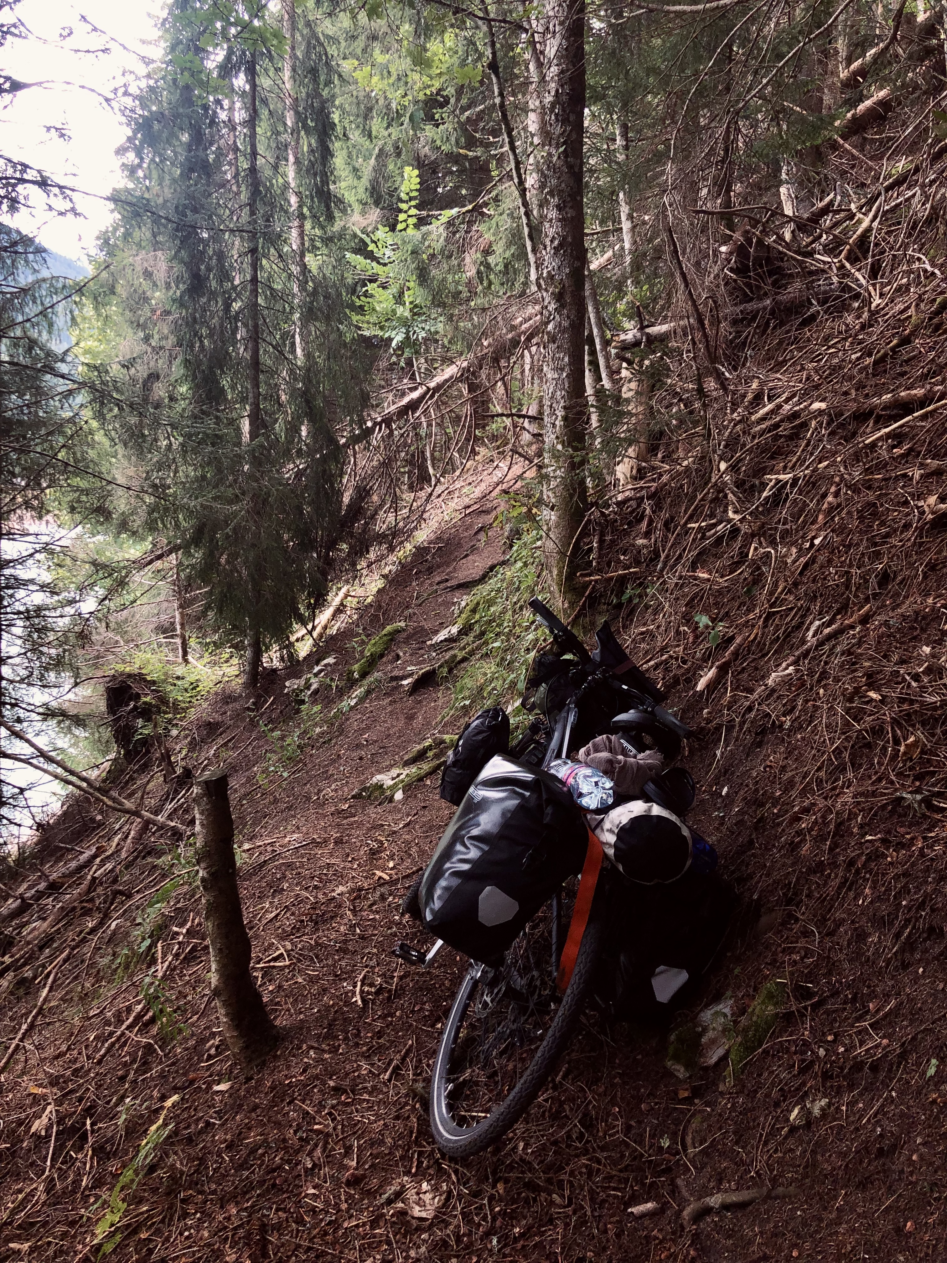 This time “How hard can it be?” turns out impossible. I have to turn around, carry my bike back. Up on the right down on the left, if I fall I’ll drown in the lake. But I survive, not the day yet, but another attempt of my ego telling me to push and rush through.